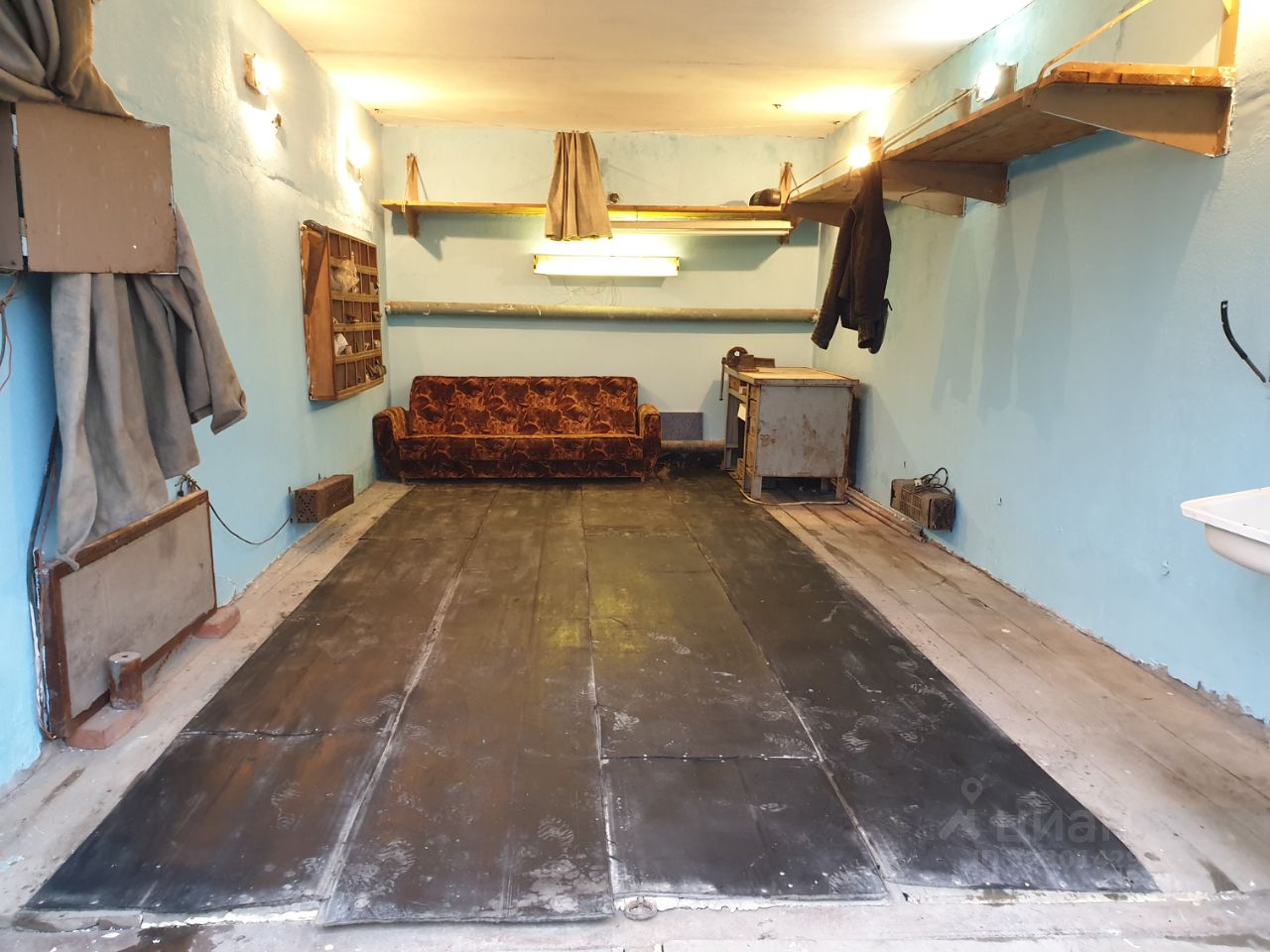Высота ворот - 2.2 м, ширина - 3 м, джип заходит легко. Общая площадь - 28 м2. Электротены, навесные стеллажи, слесарный стол с тисками.