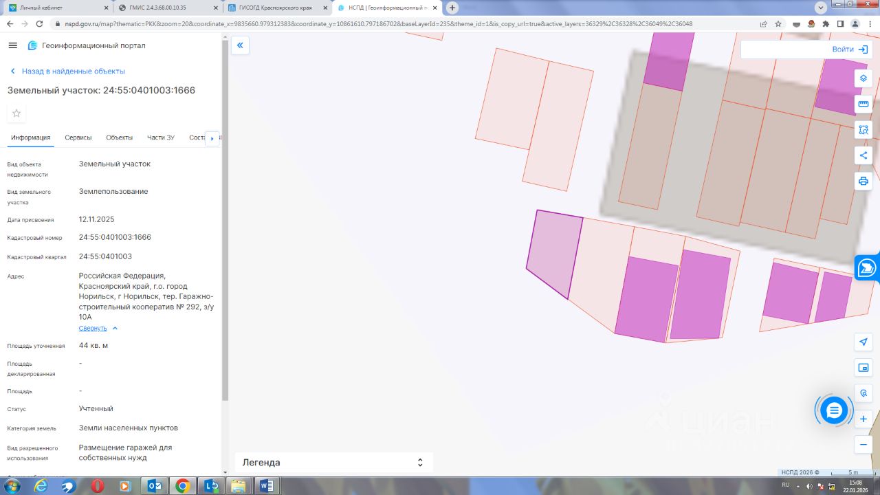 Земельный участок с кадастровым номером 24:55:0401003:1666 площадь 44 по адресу Российская Федерация, Красноярский край, г.о. город Норильск, г Норильск, тер. Гаражно-строительный кооператив 292, з/у 10А