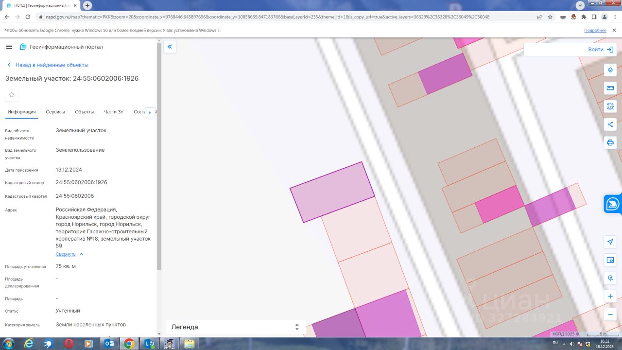 Земельный участок с кадастровым номером 24:55:0602006:1926 площадь 75 по адресу Российская Федерация, Красноярский край, городской округ город Норильск, город Норильск, территория Гаражно-строительный кооператив 18, земельный участок 59